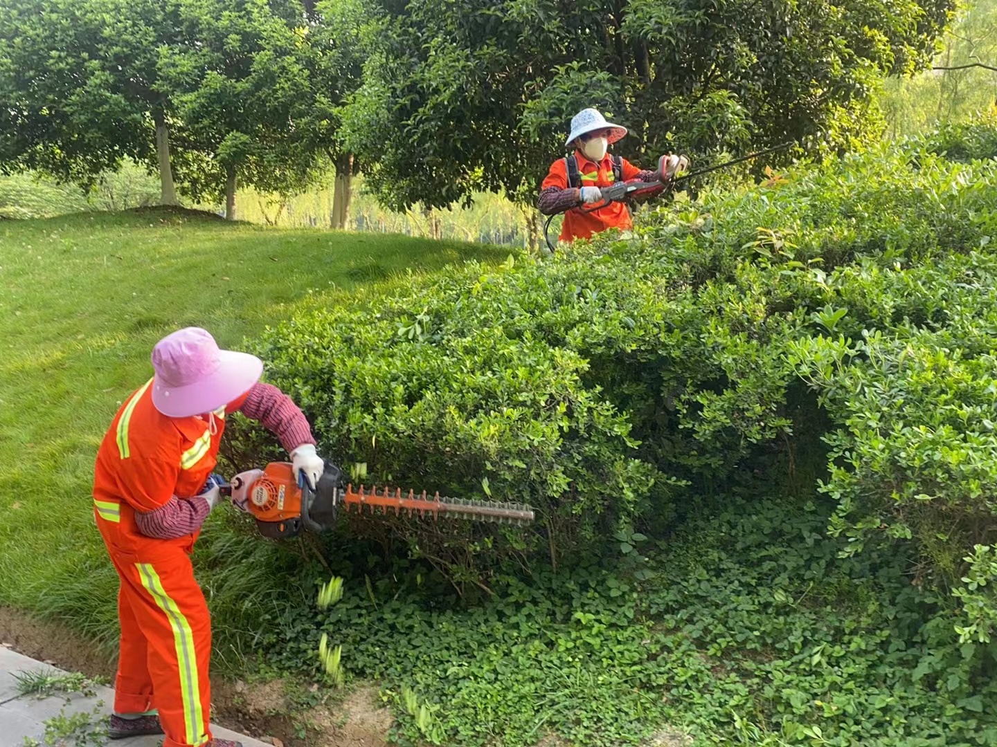 使用专用机械修剪球类造型,确保色块绿篱修剪轮廓清楚、线条整齐,球形植物形状饱满、圆润,绿化景观效果佳。