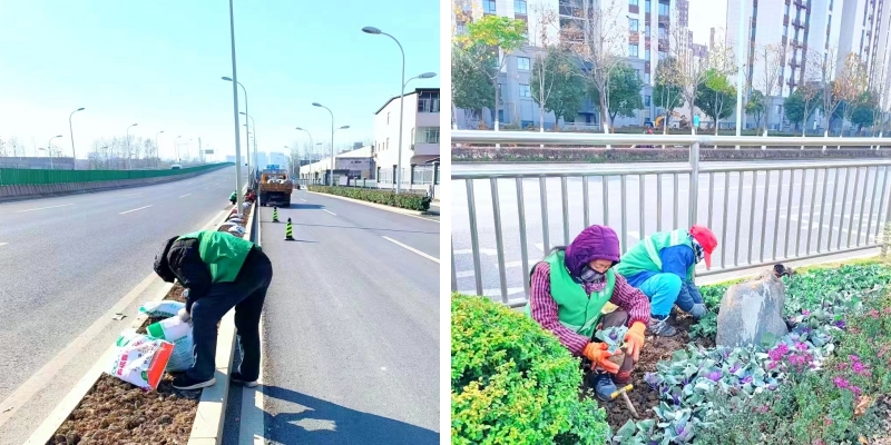 其中绿化养护方面,当前阶段重难点主要放在复壮施肥和还绿补植上。针对范围内缺株、黄土裸露问题进行面积统计,针对不同路段制定补植方案和计划,陆续安排人员对缺株位置进行补植。其次面对存在植株稀疏、枯黄、长势衰弱的路段进行备案统计,制定施肥计划,并按照按计划施肥,以保证苗木长势及补植苗木的存活率。