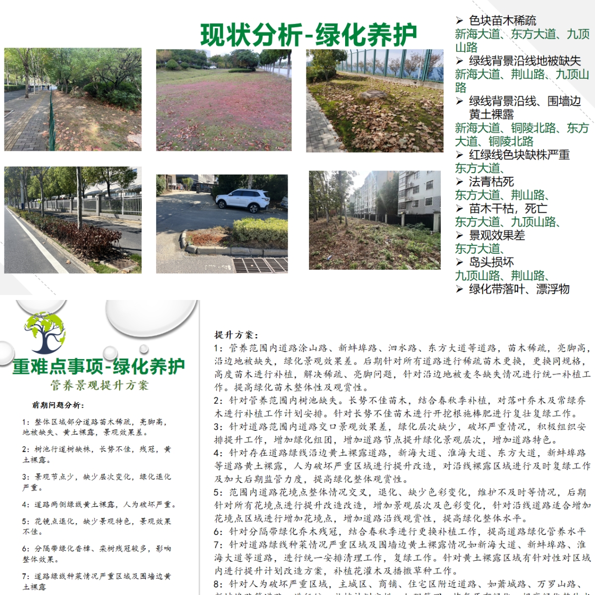 为进一步提升道路绿化效果,在项目进场准备阶段就已经开始了对铜陵北路提升计划。七里塘区域现场负责人亲自去现场测绘未提升区域的面积,制定设计方案以及苗木采购清单。本着勤恳负责的态度希望在道路绿化工作上做的更好。